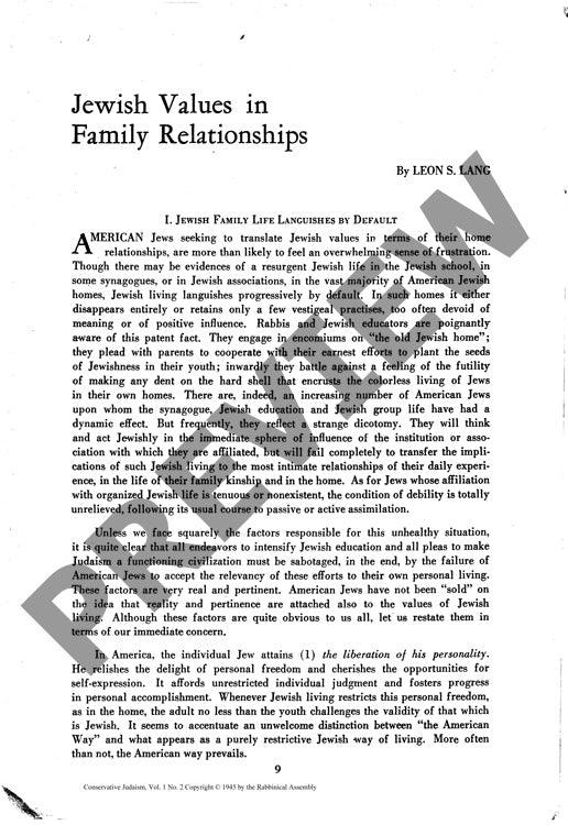 Jewish families increasingly compartmentalize their religious identity, maintaining it within synagogues and schools while traditional values fade from intimate family relationships. Against the backdrop of rapid social change in American society, four critical factors drive this erosion: the primacy of individual freedom over religious constraints, early economic independence weakening parental bonds, cultural resistance to tradition, and widespread uncertainty about reconciling ancient wisdom with modern life. Through qualitative analysis of contemporary Jewish family structures and functional interpretation of core values - Taharath Hamishpohoh (family integrity), Gidul Bonim Ubonoth (child rearing), Kibbud Av Vo-em (filial responsibility), and Sholom Bayith (family compatibility) - this research reveals how these traditional principles remain deeply relevant to family stability and personal fulfillment when thoughtfully adapted to modern democratic contexts. Successful integration of Jewish values into family life requires comprehensive adult education programs, professional family counselors versed in both religious scholarship and sociological methods, and systematic pre-marital courses addressing Jewish marriage, child-rearing, and home-building practices. The findings demonstrate that revitalized Jewish family values can enhance both individual psychological well-being and community continuity within American democratic society.