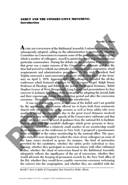 Each year, approximately 4,200 individuals embrace Judaism through Conservative conversion, yet the movement has lacked standardized procedures and support systems for this transformative process. A comprehensive survey of Rabbinical Assembly members, conducted after the watershed 1979 mini-convention on gerut (conversion), revealed both the scope and limitations of current conversion practices. Through questionnaires distributed to the entire membership, the study assessed conversion protocols, ritual adequacy, and administrative procedures across the movement. Conservative rabbis typically perform six conversions annually, with 64% expressing satisfaction regarding instruction methods. However, an overwhelming 88% called for standardized curricula from the Rabbinical Assembly, while only 40% deemed existing conversion rituals adequate. Nearly all respondents (97%) endorsed establishing permanent national conversion records and standardized certificates. Community integration showed mixed results, with 58% reporting satisfactory convert absorption, though 79% sought additional guidance. These findings demonstrate that gerut represents a significant phenomenon requiring systematic attention, particularly in developing coordinated conversion practices, enhanced educational materials, and strategies for improving community attitudes toward converts within the Conservative movement.
