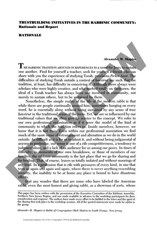 Professional isolation and chronic relational imbalances plague the modern American rabbinate, as revealed through an intensive 1978 workshop series with the Rabbinical Assembly of Northern Jersey. Through nine bimonthly two-hour sessions, eleven participating rabbis unveiled deeply rooted patterns of overgiving that originated in their families of origin and manifested in problematic congregational dynamics. The workshops, grounded in contextual therapy principles, examined the complex intersection of personal, familial, and professional relationships affecting contemporary rabbis. Analysis revealed concerning disconnections between rabbis' social service functions and their relationship with God, with participants showing greater difficulty engaging in theological discourse compared to discussing congregational matters. Rabbis exhibited persistent challenges in addressing core religious and marital concerns, while their congregational relationships frequently devolved into patterns of parentification and infantilization. Based on these findings, the research demonstrates an urgent need to restructure the modern rabbinate into genuine supportive communities (havurah) and implement systematic post-ordination professional development. Without addressing these fundamental relational imbalances and establishing robust peer support systems, the rabbinate risks continued isolation, family strain, and diminished capacity for spiritual leadership within Jewish communities.