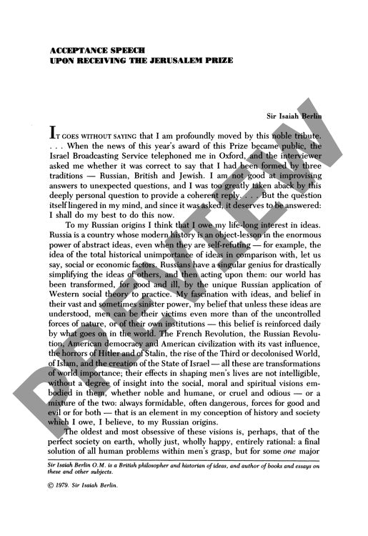 In his Jerusalem Prize acceptance speech, Sir Isaiah Berlin weaves together three formative traditions - Russian, British, and Jewish - that profoundly shaped his intellectual journey and philosophical outlook. His Russian origins instilled a deep appreciation for the transformative power of abstract ideas, exemplified by Russia's dramatic attempts to implement Western social theories. Through this lens, Berlin examines the seductive yet perilous nature of utopian visions that promise perfect societies while justifying tremendous human costs. The British empirical tradition contributed his enduring commitment to compromise, toleration, and pluralism as crucial counterweights to absolutist thinking, leading him to argue that moderate humanitarian aims foster more civilized societies than revolutionary certainties. From his Jewish heritage, Berlin derives keen insights into the essential human need for cultural belonging and communal identity, rejecting abstract internationalism in favor of particular social bonds. The Jewish experience of exile and minority status, he contends, offers vital perspective on similar deprivations faced by other peoples. These three intellectual traditions converge in Berlin's worldview as he reflects on receiving recognition from Israel - a moment that represents for him the fulfillment of Jewish aspirations for national restoration and normalized communal life.