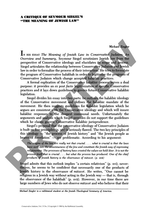 Seymour Siegel's influential essay "The Meaning of Jewish Law" attempts but ultimately fails to reconcile Conservative Judaism's ideological foundations with traditional halakhic jurisprudence. Through systematic textual analysis and philosophical critique, fundamental flaws emerge in Siegel's five-principle framework, particularly in his concepts of "the process of Jewish history" and "the Jewish people as bearer of Revelation." His reliance on historical relativism and the construct of "catholic Israel" as the ultimate arbiter of halakhic change creates logical inconsistencies and opens the door to potentially unlimited communal autonomy in religious practice. By prioritizing individual ethical sensitivities over traditional precedent, Siegel's methodology effectively reduces divine commandments to communal projections and transforms halakhic jurisprudence from a divine mandate into a consensus of individual opinions. While his approach offers solutions to contemporary halakhic challenges, it fundamentally alters traditional conceptions of Jewish law by elevating subjective moral standards above Torah authority, undermining his dual objectives of legitimizing existing Conservative practices and establishing guidelines for future halakhic legislation.