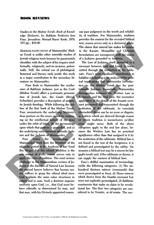 This book review examines Jose Faur's *Studies in the Mishne Torah: Book of Knowledge*, a scholarly analysis of Maimonides' legal and theological framework within Rabbinic Judaism. Faur employs philological, historical, and literary methodologies to reconstruct Maimonidean thought, tracing the intellectual development from talmudic literature through the Academy of Rav Yosef Ibn Megas. The study demonstrates that for Maimonides, tradition serves as the sole source of religious truth, while reason functions only as a rhetorical guide for applying traditional rules. Faur's key findings include a systematic categorization of the 613 mitsvot and their relationship to rabbinic authority, showing how Maimonides distinguished between Written and Oral Law while emphasizing the rabbinate's role in legal transmission. The analysis reveals Maimonides' opposition to Natural Law doctrines prevalent in Karaite, Mutazillite, and Christian formulations, arguing that these are incompatible with Judaism's covenant-based tradition. Faur concludes that Maimonides' *Mishne Torah* was designed to systematize talmudic decisions and limit post-talmudic rabbinic authority, providing Jews with direct access to their religious obligations. This work represents a significant contribution to Maimonidean scholarship by demonstrating the underlying unity between talmudic Judaism and Maimonides' systematic presentation, while challenging both secular academic interpretations and contemporary Orthodox readings of Maimonidean thought.