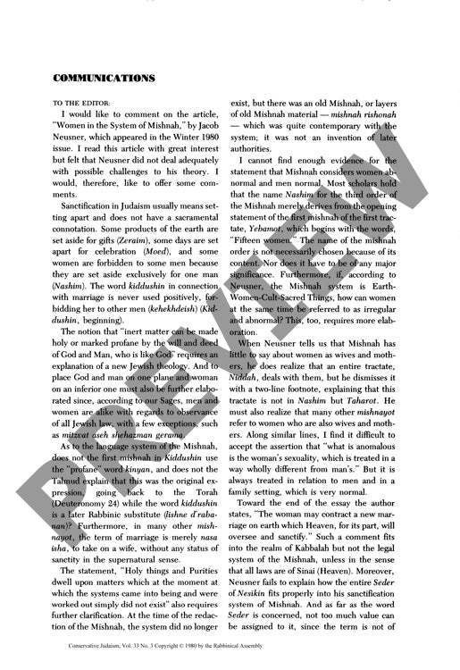 This communication presents a scholarly critique of Jacob Neusner's theoretical framework regarding women's treatment in the Mishnaic legal system. The author employs textual analysis and comparative examination of Mishnaic sources to challenge Neusner's central thesis that women are portrayed as abnormal within the system. Through systematic examination of specific tractates, particularly Nashim and Niddah, the study demonstrates that the nomenclature and organization of Mishnaic orders derive from opening statements rather than content-based categorization. The methodology involves close reading of primary sources and linguistic analysis of key terms such as kiddushin and kinyan to reveal their historical development and theological implications. The research finds insufficient evidence supporting claims that women's sexuality is treated as anomalous, arguing instead that such treatment occurs within normative family contexts. The analysis reveals that Neusner's sanctification framework inadequately addresses the complexity of gender roles in Mishnaic law, particularly regarding the Seder Nesikin's integration into his theoretical system. The study concludes that while women receive differential treatment compared to men in Mishnaic literature, this represents social stratification rather than intrinsic theological inferiority, requiring more substantial evidence to support Neusner's interpretative framework.