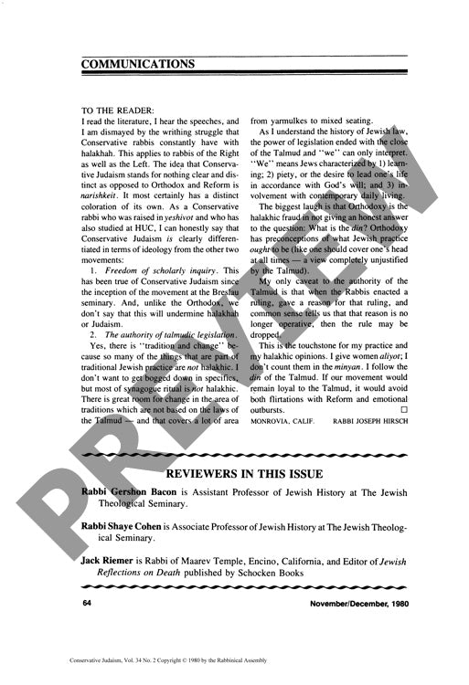 This communication examines the ideological foundations and halakhic methodology of Conservative Judaism through correspondence from practicing rabbis. The analysis presents two distinct perspectives on Conservative Jewish practice and legal interpretation. The first contributor argues for strict adherence to Talmudic authority while advocating for selective modifications based on contemporary relevance, specifically regarding women's participation in religious practices. This approach maintains that halakhic interpretation should be limited to scholars possessing learning, piety, and contemporary engagement. The second perspective articulates Conservative Judaism's distinctive characteristics, emphasizing two fundamental principles: freedom of scholarly inquiry without fear of undermining Jewish law, and recognition of Talmudic legislative authority while distinguishing between halakhic requirements and customary traditions. The methodology reveals that Conservative Judaism occupies a unique ideological position, differentiated from both Orthodox and Reform movements through its balanced approach to tradition and adaptation. The findings suggest that Conservative Judaism's apparent internal struggles reflect not ideological confusion but rather a sophisticated interpretive framework that maintains Talmudic authority while permitting evolution in non-halakhic traditional practices, thereby preserving Jewish authenticity while addressing contemporary needs.