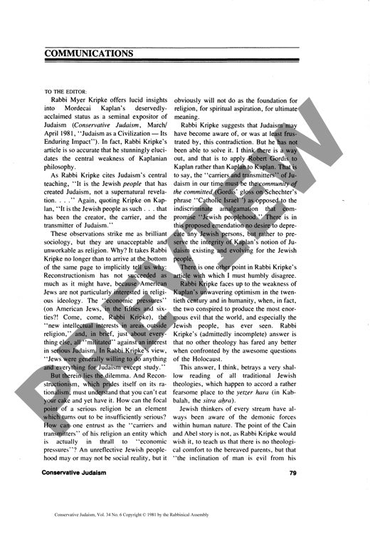 This collection of scholarly communications examines fundamental tensions within contemporary Jewish theological and philosophical discourse, particularly focusing on Mordecai Kaplan's Reconstructionist philosophy and Conservative Judaism's eschatological framework. The methodology consists of critical theological analysis through correspondence and scholarly debate published in Conservative Judaism journal. The primary findings reveal significant critiques of Kaplan's naturalistic approach to Judaism, which positions the Jewish people as creators and transmitters of Jewish religion rather than recipients of supernatural revelation. Contributors argue this framework proves insufficient for authentic religious foundation, as it relies upon a Jewish populace demonstrably uninterested in serious religious study or commitment. The analysis further challenges Kaplan's optimistic anthropology, particularly given twentieth-century historical realities including the Holocaust, contrasting this with traditional Jewish recognition of the yetzer hara (evil inclination). Additionally, the communications address Conservative Judaism's need for renewed eschatology, arguing that survival-based religious motivation remains inadequately ultimate. The key conclusion emphasizes that authentic Jewish religious vitality requires kabbalat ol malkhut shamayim (acceptance of divine sovereignty) as its primary focus, with conscious service to God rather than mere Jewish survival or cultural preservation constituting the ultimate religious goal. These exchanges illuminate ongoing debates regarding naturalistic versus theocentric approaches to contemporary Jewish religious life.