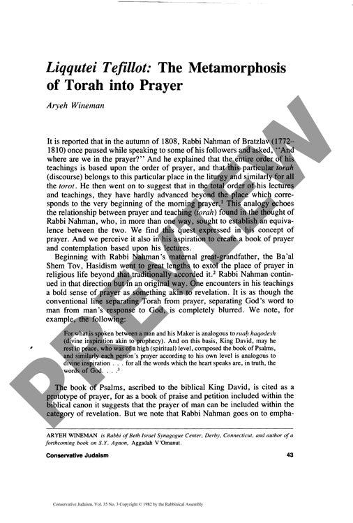 For Rabbi Nahman of Bratzlav (1772-1810), prayer was not merely human supplication but divine revelation itself - God's own words flowing through human vessels. This radical reconceptualization found its fullest expression in *Liqqutei Tefillot*, where his disciple Nathan of Nimerov transformed Rabbi Nahman's theoretical teachings into deeply personal prayers. Through comparative analysis of Rabbi Nahman's original discourses (*torot*) and their devotional adaptations, a systematic metamorphosis emerges: abstract theological exposition becomes intimate spiritual dialogue, third-person theory transforms into first-person confession, yet the core theological principles remain intact. The textual analysis reveals how Nathan's adaptations maintain theological continuity while addressing pressing existential concerns, demonstrating the practical application of Rabbi Nahman's vision that prayer and Torah study represent complementary channels of divine encounter. *Liqqutei Tefillot* thus stands as a unique contribution to Hasidic spirituality, embodying Rabbi Nahman's teaching that authentic prayer serves messianic purposes within Bratzlav Hasidism.