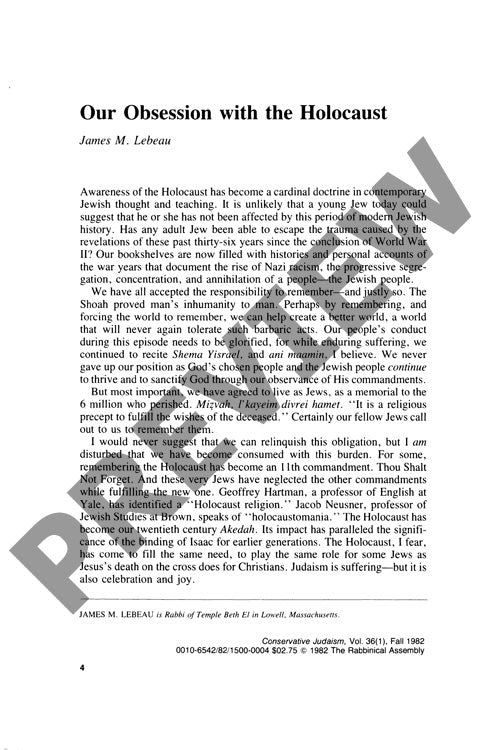 The Holocaust's central position in contemporary Jewish identity raises a critical paradox: excessive focus on this historical tragedy may actually undermine substantive Jewish religious and cultural life. While Holocaust remembrance remains essential, its dominant role has created what scholars term "Holocaust religion" or "holocaustomania," transforming communal memory into a potential barrier to authentic Jewish practice. Through comparative historical analysis, this research draws revealing parallels between today's Holocaust emphasis and Jewish responses to the Temple's destruction in 70 C.E., examining educational curricula and community practices across both periods. The findings reveal that Holocaust-centered Judaism often promotes a "Judaism of defiance without substance," where remembrance substitutes for active religious observance and cultural engagement. This dynamic reinforces problematic victimhood narratives for non-Jewish audiences while generating counterproductive guilt among both Jewish and non-Jewish communities. Moreover, Holocaust obsession paradoxically facilitates assimilation by providing superficial Jewish identification without meaningful religious commitment. Authentic Jewish continuity requires shifting emphasis from mere survival to the preservation and practice of Judaism itself, integrating Holocaust memory within, rather than substituting for, comprehensive Jewish education and observance. Sustainable Jewish identity must balance historical remembrance with celebration of Jewish life, learning, and religious practice.