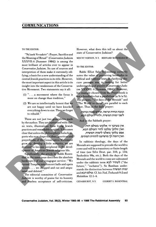 Conservative Judaism's intellectual discourse reveals a movement grappling with fundamental tensions between tradition and change. Through textual analysis of letters and responses in the journal Conservative Judaism, two critical scholarly debates emerge: a technical dispute over the grammatical distinction between hendiadys and parallelism in liturgical texts regarding messianic concepts, and a broader questioning of the movement's institutional direction and liturgical reforms. The research methodology focused on analyzing published communications about biblical interpretation, liturgical practices, and movement self-assessment. Findings demonstrate how rabbinic theology conceptualizes messianic periods and the world to come as distinct sequential phases, while simultaneously exposing Conservative Judaism's institutional challenges. The movement's commitment to intellectual honesty and liturgical modification appears to have inadvertently undermined its religious authenticity and congregational worship experience. Evidence suggests an imbalanced focus on change over tradition preservation, coupled with destructive critique lacking reconstructive solutions. Without greater philosophical and practical maturity among its leadership, Conservative Judaism risks further marginalization within American Jewish religious life.