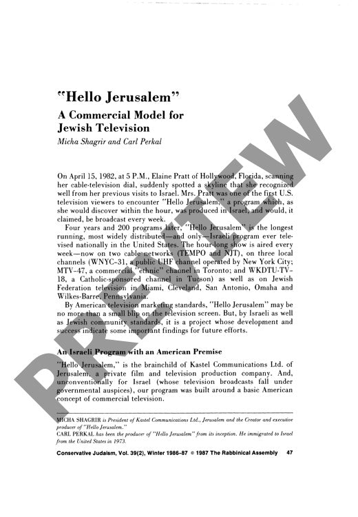"Hello Jerusalem" revolutionized Israeli television distribution in America by becoming the first program to achieve national reach while proving that Jewish-themed content could attract diverse audiences. From 1982-1986, Kastel Communications Ltd. produced weekly hour-long magazine shows featuring Israeli lifestyle content, reaching approximately ten million homes through cable networks and local channels. The program's commercial strategy centered on creating entertainment-focused content that would appeal to identifiable audience segments, particularly viewers interested in Israel-linked messaging. Analysis of viewership data revealed unexpected success in attracting both Jewish and Christian audiences, with Christians comprising 25-35% of total viewers. While the commercial model secured major Israeli advertisers including El Al Airlines, banks, and hotels, demonstrating precise audience metrics remained challenging without access to expensive rating systems. The program's operational history established a replicable framework for Jewish commercial broadcasting in North America, though sustained success would require expanded inter-organizational cooperation, American broadcasting partnerships, and continued financial investment. These findings suggest the viability of a comprehensive Jewish television network that could serve both American Jewish communities and broader Israeli-American cultural exchange objectives.