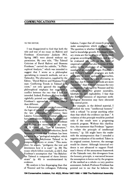 Editorial decisions can fundamentally alter a scholarly work's philosophical foundations, as evidenced in the case of a critical analysis comparing David Halivni and Shamma Friedman's Talmudic methodologies. When viewed through Imre Lakatos's philosophy of science framework, these scholars' competing approaches reveal distinct patterns of knowledge development beyond mere empirical validation. By applying Lakatosian concepts of hard core assumptions and progressive research programs, the analysis demonstrates that Friedman's literary strata theory exhibits superior scientific characteristics - particularly in neutrality, falsifiability, and replicability - compared to Halivni's critical methods. Though Jacob Neusner and others challenge Friedman's geological metaphor for Talmudic textual layers as lacking historical evidence, its explanatory power in resolving textual difficulties justifies its continued use. However, editorial modifications to the original manuscript, including title changes and removal of methodological discussions, undermined the intended positive assessment of Friedman's approach. This analysis advances Talmudic scholarship by evaluating competing methodologies through contemporary philosophy of science frameworks, while demonstrating how editorial decisions can impact scholarly discourse.