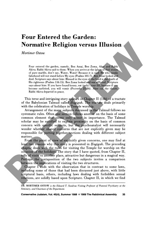 A cryptic Talmudic tale of four rabbis who "entered the garden" masks a profound warning about the psychological perils of mystical practice. The narrative from Hagigah 14b chronicles how three of the four protagonists met tragic fates: Ben Azzai died, Ben Zoma suffered mental collapse, and Aher (Elisha ben Avuyah) abandoned his faith, while Rabbi Akiva emerged unscathed only to later support the disastrous Bar Kokhba rebellion. Through psychoanalytic investigation of their biographical profiles, this research reveals that mystical pursuits did not cause these outcomes, but rather attracted individuals already harboring psychological vulnerabilities. Clinical evidence and dream analysis demonstrate how gnostic journeys often represent fantasies of maternal refuge, particularly appealing to those with psychotic, borderline, and depressive tendencies seeking escape from reality. The investigation identifies three escalating dangers of apocalyptic mysticism: individual psychological deterioration, loss of religious conviction, and communal catastrophe when charismatic figures promote millenarian movements. These findings suggest the narrative serves as a deliberate cautionary tale, highlighting organized religion's vital role in containing dangerous apocalyptic impulses through regulated religious experience while protecting both individual and communal stability from the destabilizing effects of unfettered mystical speculation.