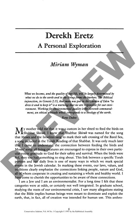 Jewish tradition offers a comprehensive environmental ethic through derekh eretz - "the way of the earth" - that remains surprisingly relevant for addressing modern ecological challenges. Through systematic examination of Jewish laws, precepts, and calendar observances, clear environmental themes emerge within traditional practice, centered on two interconnected pillars: ethical treatment of all life forms and agricultural stewardship of land, water, and animals. Key holidays including Tu Bi-Shevat, Pesah, Shavuot, and Sukkot demonstrate how the Jewish calendar deliberately integrates seasonal awareness and agricultural cycles into religious life. Core concepts like bal tash-hit (prohibition against destruction), tzaar baalei hayyim (preventing animal suffering), Shemitah (sabbatical year for land), and tikkun olam (repairing the world) establish foundational environmental principles that guide daily behavior. Using qualitative, reflective methodology, this personal exploration reveals how derekh eretz encompasses both proper ethical conduct toward humans and alignment with natural patterns - suggesting ancient wisdom for developing Jewish environmental consciousness and action in our time.