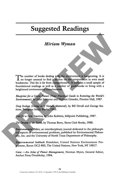 This bibliographic compilation by Miriam Wyman presents a curated selection of foundational and practical environmental literature addressing the growing intersection of ecological consciousness and daily living. The methodology consists of a selective review of key texts spanning environmental philosophy, practical guidelines, and interdisciplinary perspectives on human-nature relationships. The compilation includes seminal works in deep ecology, environmental ethics, and ecological management, alongside practical guides for environmentally conscious living. Notable inclusions encompass philosophical frameworks such as Devall and Sessions' deep ecology principles, Berry's spiritual ecology perspectives, and Barbour's examination of Western environmental ethics. The selection also incorporates practical resources including lifestyle modification guides and specialized publications like Environmental Ethics journal and Environmental Sabbath Newsletter. A significant component addresses the integration of religious perspectives, particularly Judaism, with ecological thought through Swetlitz's sourcebook on Jewish environmental ethics. The findings indicate a burgeoning field of environmental literature that bridges theoretical foundations with practical applications, reflecting increased public environmental awareness during the 1980s-1990s period. The compilation demonstrates the interdisciplinary nature of environmental discourse, encompassing philosophical, spiritual, scientific, and practical dimensions essential for comprehensive environmental understanding and action.