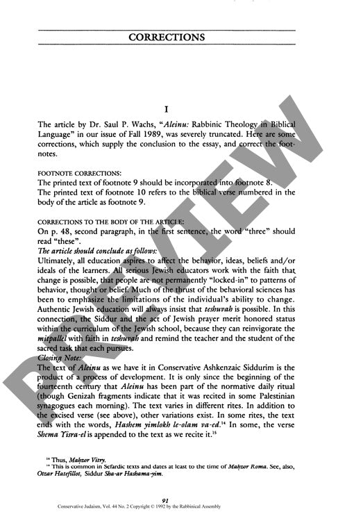 This correction presents the complete conclusion and textual amendments to Dr. Saul P. Wachs' article "Aleinu: Rabbinic Theology in Biblical Language" from Conservative Judaism's Fall 1989 issue. The methodology involves philological analysis of liturgical development and historical examination of prayer book variations across Jewish communities. The study traces the textual evolution of the Aleinu prayer, demonstrating that it became part of normative daily ritual only from the fourteenth century onward, with earlier Genizah fragments indicating limited Palestinian synagogue usage. Key findings reveal significant textual variations across different liturgical rites, including excised verses, alternative endings, and community-specific additions. The research documents distinct practices in Ashkenazic, Sefardic, and pre-expulsion English Jewish communities, establishing that liturgical modification represents a continuous historical process rather than modern innovation. The author concludes that authentic Jewish education must maintain faith in teshuvah (repentance) and personal transformation, positioning the Siddur as essential curriculum. The study supports the Conservative movement's moderate liturgical approach, arguing that the historical precedent of Aleinu's development legitimizes careful liturgical renewal that balances traditional commitment with contemporary responsiveness.
