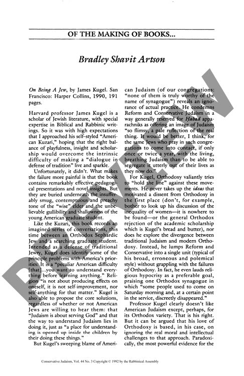 Contemporary Jewish scholarship stands at a crossroads between passionate religious engagement and academic objectivity, as revealed through analysis of three influential modern works. Through qualitative literary examination of James Kugel's "On Being A Jew," the ArtScroll Talmud Bavli series, and Byron Sherwin's "In Partnership with God," significant tensions emerge regarding denominational perspectives and pedagogical effectiveness in Jewish studies. While Kugel offers valuable insights into American Jewish priorities and religious practice, his contemptuous treatment of non-Orthodox movements and avoidance of core theological challenges weakens his contribution. The ArtScroll series succeeds pedagogically with its comprehensive commentary but falters in its narrow hashkafic perspective and wholesale rejection of academic scholarship. Sherwin's religiously-motivated scholarship demonstrates creative applications and thorough documentation, though suffers from repetitive writing and dated critiques of objective scholarship. Evidence from these works suggests that Jewish scholarship flourishes best through passionate, engaged approaches rather than detached objectivity—while still demanding methodological rigor and denominational inclusivity.