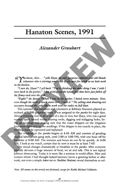 This ethnographic study examines life at Kibbutz Hanaton, Israel's first Conservative kibbutz, through participant observation conducted during a summer residency in 1991. The methodology employed direct engagement in kibbutz activities including agricultural work, childcare responsibilities, kitchen duties, and community functions. The research documents daily routines, social structures, and challenges facing this religious kibbutz community of approximately one hundred members. Key findings reveal significant tensions between traditional kibbutz collectivism and individual aspirations, exemplified through detailed case studies of community members struggling with limited opportunities for personal development. The study identifies critical challenges including economic pressures, difficulty attracting new members, minimal connection to the broader Conservative movement despite its designation, and questions regarding long-term viability due to small size and resource constraints. The analysis demonstrates that while Hanaton maintains traditional kibbutz structures and observes Conservative religious practices, it operates essentially as a secular kibbutz with limited daily religious engagement. The research concludes that economic advantages rather than ideological commitment increasingly motivate membership, raising questions about sustainability. Despite these challenges, the study suggests Hanaton represents a viable model for American Jewish engagement with Israeli community life, though its future depends on successfully balancing collectivist principles with individual needs while addressing fundamental demographic and economic pressures.