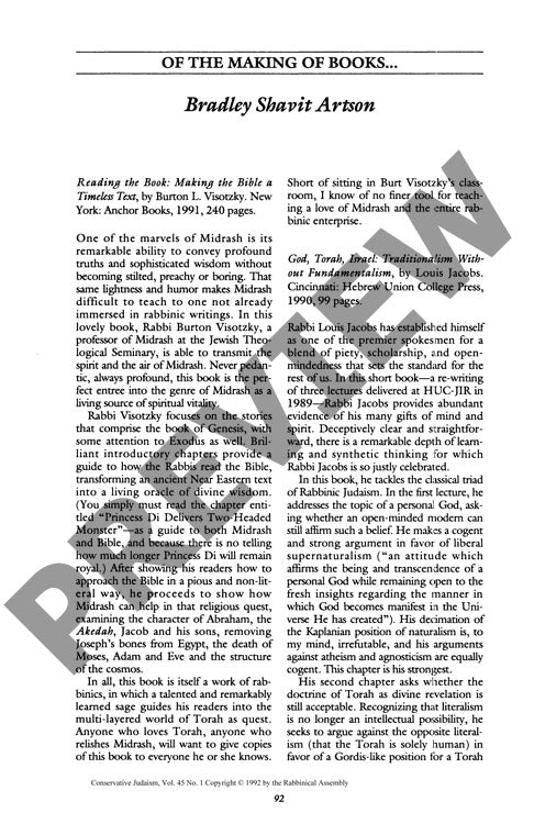 This book review examines four significant scholarly works in Jewish studies, religious thought, and biblical archaeology. The review employs critical analysis methodology to evaluate each text's contributions to contemporary religious scholarship. The first work, Louis Jacobs' "God, Torah, Israel: Traditionalism Without Fundamentalism," presents a synthesis of Conservative Jewish theology addressing divine personhood, Torah as revelation, and Jewish chosenness, advocating for "liberal supernaturalism" and "halakhic non-fundamentalism." Burton Visotzky's "Reading the Book: Making the Bible a Timeless Text" demonstrates innovative pedagogical approaches to Midrash, successfully transmitting rabbinic wisdom through accessible yet profound commentary on Genesis narratives. The review also highlights the Jewish Theological Seminary's renewed commitment to publishing critical Hebrew editions of rabbinic texts, marking a significant return to textual scholarship leadership. Amihai Mazar's archaeological survey provides comprehensive documentation of ancient Near Eastern material culture but lacks interpretive depth regarding controversial findings. Finally, James Jones' "Contemporary Psychoanalysis & Religion" revolutionizes the psychology-religion dialogue through object-relations theory, demonstrating how transference mechanisms facilitate healthy religious experience rather than pathological behavior. The analysis concludes that these works collectively advance interfaith dialogue, Jewish textual scholarship, and the integration of psychological insights with religious practice, representing significant contributions to contemporary religious studies.
