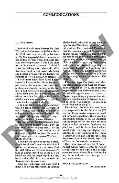 This communication presents historical insights into the 1941 controversy surrounding Rabbi Mordecai Kaplan at the Jewish Theological Seminary (JTS) following the publication of *The New Haggadah*. Drawing from firsthand accounts and archival sources, the study examines the institutional dynamics that led to Kaplan's retention despite significant theological opposition from conservative faculty members, particularly Louis Ginzberg. The methodology relies on personal testimonies, correspondence, and administrative documents from key figures including Ira Eisenstein and Seminary leadership. The analysis reveals that Moshe Davis's political counsel to Chancellor Louis Finkelstein proved decisive, arguing that maintaining both Ginzberg and Kaplan would demonstrate the Seminary's university-like tolerance for diverse scholarly perspectives while preserving financial support from various constituencies. The findings indicate that this decision had profound consequences for Conservative Judaism's ideological development, preventing the formulation of a unified platform due to irreconcilable theological differences between traditionalist and reconstructionist positions. The study concludes that Finkelstein's pragmatic approach to institutional management inadvertently delayed the Reconstructionist movement's independence until 1968, while simultaneously hindering Conservative Judaism's ability to articulate coherent doctrinal positions until after the denominational separation occurred.