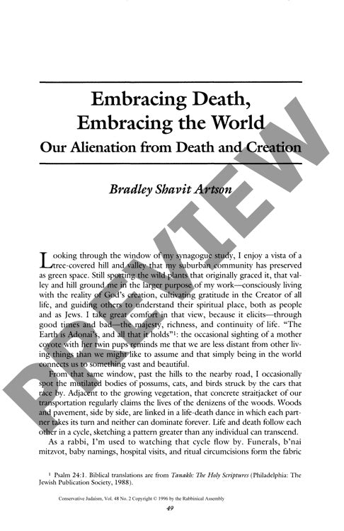 Modern society's parallel fears of death and disconnection from nature stem from the same existential insecurity, creating a cycle of alienation that threatens both psychological and ecological well-being. Drawing from rabbinical perspective and environmental ethics, an observational analysis of synagogue experiences, Jewish law, and traditional death practices reveals a stark contrast between historical and contemporary approaches to mortality. While traditional Jewish burial customs emphasized community involvement, simple practices, and direct earth contact, modern funeral traditions increasingly isolate the deceased from natural processes through concrete vaults and elaborate preservation methods. Cultural attempts to deny mortality and dominate nature create deeper anxiety rather than providing comfort, whereas traditional Jewish death rituals maintained integration between human mortality and natural cycles. The research demonstrates how contemporary burial practices mirror broader environmental disconnection, suggesting that accepting human mortality and recognizing our embedded position within creation offers a more sustainable and psychologically healthy approach. This religious-environmental framework positions humans as caretakers rather than masters of creation, simultaneously addressing death anxiety and environmental degradation through humble acknowledgment of our place within God's creation.