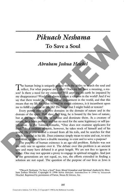 Abstract This essay examines the fundamental question of Jewish existence and spiritual purpose through philosophical and theological analysis. Heschel employs a hermeneutical methodology, drawing upon classical Jewish texts, Talmudic sources, and prophetic literature to explore the dual nature of human existence within natural and spiritual domains. The study investigates the concept of *pikuach neshama* (saving the soul) as a framework for understanding Jewish spiritual obligation and collective responsibility. Through comparative analysis of historical examples, including prophetic critiques of materialism and observations of contemporary moral failures, Heschel demonstrates that Jewish existence transcends mere survival to constitute a spiritual mission. The research reveals that Jewish identity encompasses both individual soul (*neshama*) and collective spirit, sustained through historical memory, ritual practice (*mitzvot*), and commitment to holiness (*kedushah*). Key findings indicate that Jewish continuity depends not on passive preservation but active spiritual engagement that transforms ordinary actions into sacred acts. The analysis concludes that Jewish existence serves as a paradigm for humanity's spiritual potential, with Jews bearing responsibility for maintaining divine presence (*Shekhinah*) in the world. Heschel argues that this mission becomes particularly urgent in the post-Holocaust era, where Jewish survival represents humanity's capacity for spiritual renewal and moral restoration.