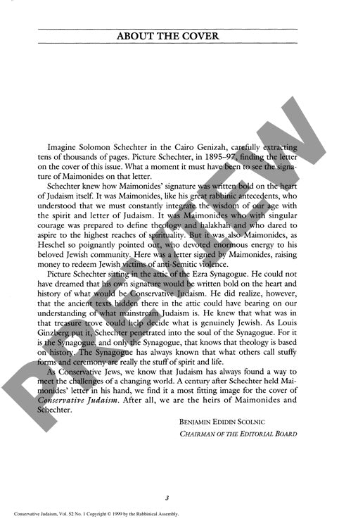 This editorial essay examines the historical and symbolic significance of Solomon Schechter's discovery of a Maimonides-signed letter in the Cairo Genizah during his 1895-97 expedition. The author employs historical narrative and theological reflection to explore the parallel contributions of both scholars to Jewish intellectual tradition. The methodology consists of interpretive analysis connecting Schechter's archaeological work with Maimonides' theological legacy, drawing upon Louis Ginzberg's scholarship and Abraham Joshua Heschel's insights. The study demonstrates how Schechter's discovery of the letter, written by Maimonides to raise funds for Jewish victims of persecution, exemplifies the integration of scholarly pursuit with communal responsibility. The analysis reveals that both figures shared a commitment to adapting Jewish wisdom to contemporary challenges while maintaining traditional foundations. The author argues that Schechter's work in the Genizah parallels Maimonides' approach to synthesizing ancient wisdom with modern understanding. The essay concludes that Conservative Judaism inherits this dual legacy of intellectual rigor and practical engagement, positioning the Maimonides letter as an appropriate symbol for contemporary Conservative Jewish identity. The work contributes to understanding how historical discoveries inform modern Jewish theological and communal development.