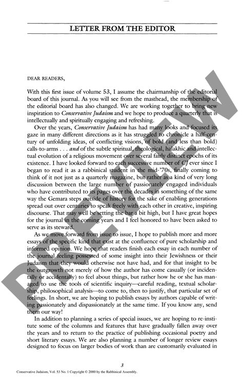 This editorial letter announces the commencement of Martin S. Cohen's tenure as chairman of the editorial board for Conservative Judaism journal's 53rd volume. The methodology involves a reflective analysis of the journal's historical trajectory and articulation of future editorial vision. Cohen examines the publication's evolution over five decades, characterizing it as chronicling the intellectual, spiritual, theological, and halakhic development of the Conservative Jewish movement through distinct historical epochs. The editor conceptualizes the journal as facilitating intergenerational discourse comparable to Talmudic methodology, enabling scholarly dialogue across temporal boundaries. Key findings include identification of the journal's role as a forum for passionate yet academically rigorous scholarship that bridges pure research and informed opinion. The editorial vision emphasizes publishing essays utilizing scientific inquiry tools—textual scholarship, careful reading, and philosophical analysis—to generate meaningful insights into Jewish identity and practice. Planned initiatives include special thematic issues, reinstatement of discontinued features, publication of poetry and literary essays, extended review essays, and potential conference sponsorship. The letter concludes with tribute to predecessor Samuel H. Dresner, acknowledging his foundational editorial contributions from 1955-1964. The methodology demonstrates continuity with established editorial traditions while proposing innovative approaches to contemporary Jewish intellectual discourse.