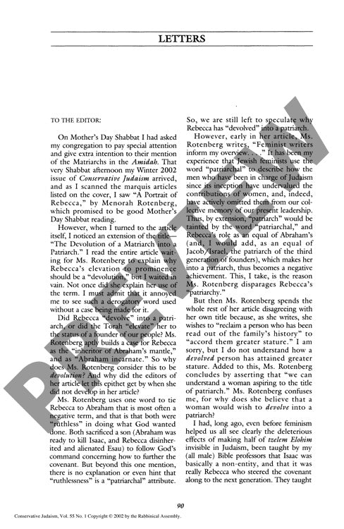 A single word - "devolution" - sparked heated scholarly debate about the biblical matriarch Rebecca's true status in Jewish tradition. Through analysis of 2002 correspondence in Conservative Judaism between Rabbi Ari Markcartun and scholar Menorah Rotenberg, fundamental tensions emerge in how feminist biblical scholarship characterizes female religious authority. The exchange centers on Rotenberg's article "A Portrait of Rebecca: The Devolution of a Matriarch into a Patriarch," where Markcartun challenges her use of "devolution" as contradictory and needlessly negative, given Rebecca's demonstrated equality with Abraham as a covenant founder. Rotenberg's response defends her terminological choice by citing dictionary definitions of "devolution" as succession rather than decline. Beyond semantic disagreement, the correspondence reveals broader challenges in Jewish feminist scholarship: how patriarchal language shapes interpretation of women's roles, and how imprecise academic terminology can obscure rather than illuminate female biblical figures. The findings highlight the need for more nuanced language when discussing gender and religious authority in Jewish textual traditions.