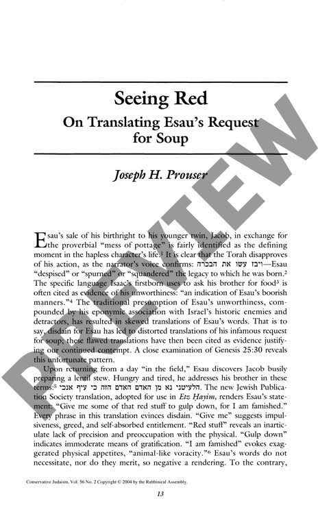 For centuries, translators have portrayed Esau's request for soup in Genesis 25:30 as the crude demands of a glutton, reflecting deep-seated anti-Esau bias rather than linguistic accuracy. Detailed philological analysis of the Hebrew text reveals a markedly different picture: Esau's words demonstrate unexpected elegance and restraint. Through close examination of key Hebrew terms, comparative analysis of various translations including the Targumim, and consideration of classical commentaries by Rashi, Ibn Ezra, and others, this research challenges conventional renderings like "Give me some of that red stuff to gulp down." The hapax legomenon "haliteini" more likely indicates restrained sampling than crude consumption, while the particle "na" - consistently translated as "please" elsewhere - is conspicuously omitted from Esau's speech in most translations. Similarly, the repetitive "ha'adom ha'adom" suggests poetic emphasis rather than inarticulate haste. These findings support an alternative translation: "Please may I have just a taste of that lovely red soup, weary as I am." This fresh analysis exposes how historical prejudices against Esau as Israel's enemy have perpetuated translation choices that obscure the biblical text's literary sophistication and moral complexity.
