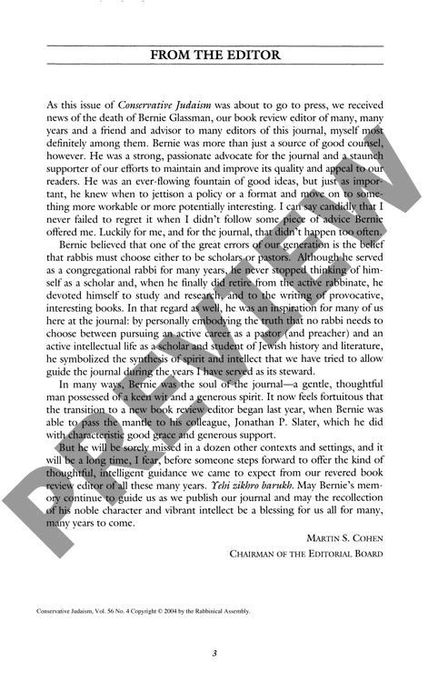 This editorial tribute examines the scholarly and pastoral contributions of Bernie Glassman, the longtime book review editor of Conservative Judaism journal, following his recent death. The methodology employed is a retrospective analysis of Glassman's editorial philosophy and professional approach, drawing from the author's direct experience working with him over many years. The study highlights Glassman's dual commitment to rigorous scholarship and congregational leadership, challenging the conventional dichotomy between academic and pastoral rabbinical roles. Key findings demonstrate how Glassman embodied the synthesis of intellectual pursuit and spiritual guidance, serving as both a congregational rabbi and an active scholar throughout his career. His editorial contributions included strategic policy recommendations, format innovations, and consistent advocacy for maintaining journal quality. The analysis reveals Glassman's belief that contemporary rabbis need not choose between scholarly and pastoral vocations, a principle he exemplified through his transition from active rabbinate to dedicated research and writing. The editorial concludes that Glassman's integrated approach to rabbinical identity served as a guiding model for the journal's editorial philosophy, representing the synthesis of spirit and intellect that defined the publication's scholarly mission.