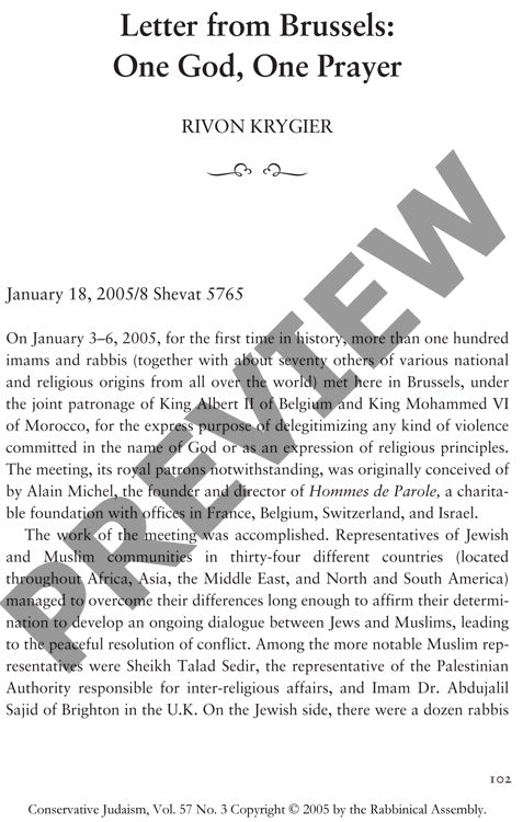Can religious leaders transcend centuries of division through shared prayer? In January 2005, an unprecedented gathering in Brussels brought together over one hundred imams and rabbis from thirty-four countries, united under the patronage of Belgium's King Albert II and Morocco's King Mohammed VI. Through participant observation, this research documents how the conference, organized by Hommes de Parole, worked to delegitimize religious violence and build bridges between Jewish and Muslim communities. While participants successfully crafted a declaration condemning violence in religion's name, the path to systemic change in Jewish-Muslim relations proved more complex. A spontaneous Sufi prayer workshop emerged as a pivotal moment, revealing how shared monotheistic traditions could transcend denominational boundaries while preserving religious authenticity. Though the immediate impact of such gatherings remains modest, they lay crucial groundwork for future interfaith cooperation and challenge long-held assumptions about religious exclusivity. These findings advance our understanding of contemporary interfaith dialogue approaches and illuminate the potential role of religious leadership in conflict resolution.