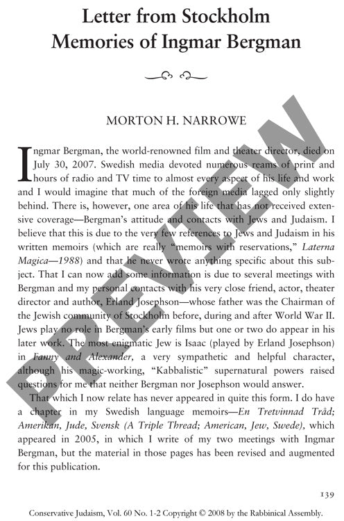 Through intimate conversations and personal encounters, legendary filmmaker Ingmar Bergman revealed a profound, previously undocumented fascination with Judaism and Jewish theology. Drawing upon two direct meetings and insights from actor Erland Josephson, whose father led Stockholm's Jewish community, Chief Rabbi Emeritus Morton H. Narrowe illuminates an unexplored dimension of Bergman's intellectual life. The research challenges long-standing assumptions about Bergman's alleged anti-Semitism and his family's supposed Nazi sympathies mentioned in "Laterna Magica," presenting contradictory evidence through autobiographical narrative and first-hand accounts. Analysis of Bergman's limited portrayal of Jewish characters, particularly Isaac in "Fanny and Alexander," is supplemented by detailed records of discussions between Bergman and Narrowe about Jewish eschatology and the afterlife. Their collaboration on George Tabori's "Goldberg Variations" at the Royal Dramatic Theatre, coupled with Bergman's remarkable request to become an "honorary Jew," reveals a complex relationship with Jewish identity that significantly revises scholarly understanding of the director's religious and cultural perspectives.