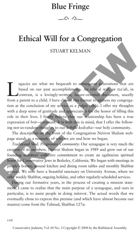 When Rabbi Stuart Kelman prepared to conclude his service at Berkeley's Congregation Netivot Shalom, he transformed the deeply personal Jewish tradition of ethical wills (tza'ah) into a revolutionary tool for congregational leadership. By adapting this traditionally parent-to-child document, Kelman created a systematic framework for articulating and transmitting core Jewish values to an entire religious community. Drawing primarily from Talmudic principles in Shabbat 127a, the framework identifies essential congregational values including adam shutaf bema'ase bereishit (partnership with God in creation), tzimtzum (making room for others through personal contraction), and letakayn olam bemalkhut shadai (establishing divine sovereignty through world repair). These principles, integrated with commitments to halakhah, Israel, and holy time observance, establish a comprehensive ethical foundation for Conservative Jewish communal life. The analysis reveals how successful religious communities must balance unwavering core values with adaptive evolution—a pattern reflected in institutional survival across alternative educational movements. This innovative application demonstrates the enduring relevance of traditional Jewish literary forms in modern communal leadership and value transmission.