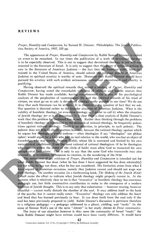 The integration of traditional Jewish wisdom with modern theological discourse remains a pressing challenge, as evidenced by four diverse works that span devotional practice, cultural criticism, liturgical study, and youth education. Through critical analysis, these reviews reveal both the strengths and limitations of recent attempts to bridge this divide. Samuel Dresner's "Prayer, Humility and Compassion" demonstrates deep scholarship in rabbinic and Hasidic sources yet falls short in engaging with rational theology, limiting its relevance for contemporary American Judaism. Erich Kahler's "The Tower and the Abyss" offers penetrating insights into the dehumanizing effects of collectivization and technology on individual identity, particularly in Nazi Germany, though his proposed Communities of Work solution proves unrealistic and notably omits religious perspectives. A review of the Hebrew liturgical commentary "Siddur Tzlota D'Avraham" highlights the understudied field of prayer book exegesis as a crucial theological discipline. Finally, an assessment of two volumes in the "Covenant Books" series examines their efficacy in conveying Jewish historical figures and values to young readers. Together, these reviews illuminate the ongoing tension between preserving traditional Jewish scholarship while making it accessible and meaningful to modern audiences.