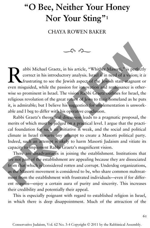 The Masorti movement stands at a crossroads in Israeli society, facing pressure to translate its religious influence into direct political power through a new Conservative Jewish political party. Yet analysis of Israeli political dynamics and religious-state relations reveals that such a move would likely undermine rather than advance the movement's spiritual mission. Through theoretical examination of Israeli political behavior, historical precedents of religious parties, and comparative assessment of Orthodox political engagement, this research challenges Rabbi Michael Graetz's proposal for a Masorti political party. Political participation would compromise the movement's position as a credible alternative to establishment Judaism, expose it to the corrupting forces of coalition politics, and risk mirroring the problematic patterns seen in ultra-Orthodox parties. Meanwhile, significant Jewish spiritual renewal is already flourishing through non-Orthodox congregations, secular Jewish communities, and evolving Orthodox practices outside formal political channels. The findings demonstrate that the Masorti movement can better promote Jewish spiritual vitality through educational initiatives, congregational work, and public intellectual engagement. Authentic religious transformation emerges not through legislative mandate but through sustained educational processes and societal inspiration - a path that allows the Masorti movement to shape Israel's Jewish identity while maintaining its independence from political entanglements.