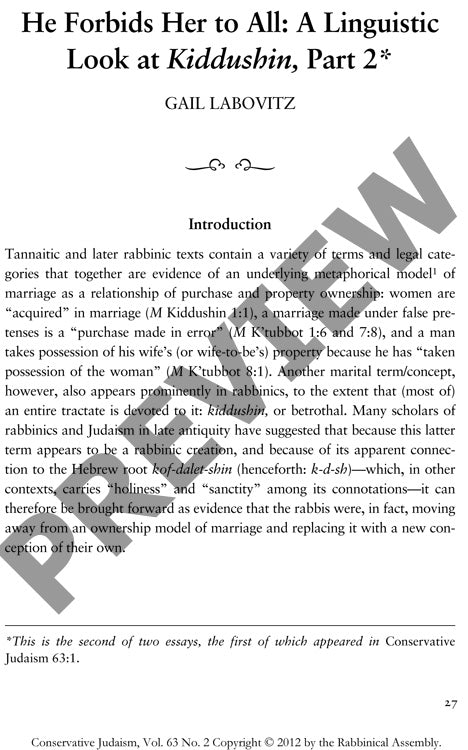 The Hebrew term kiddushin (betrothal) carries deeper implications of ownership and property rights than previously recognized by scholars who interpreted it primarily as a shift toward religious sanctification. Through cognitive linguistic analysis of tannaitic and amoraic texts, this research reveals how the root k-d-sh functions across semantic domains in ways that parallel, rather than replace, traditional acquisition terminology (k-n-h). The Babylonian Talmud's etymology of kiddushin as "he forbids her to all, like that which is sanctified to the Divine" emerges not as a departure from ownership models, but as their specialized extension. By examining how kiddushin operates synonymously with kinyan (acquisition) in rabbinic legal discourse and comparing it to hekdeish (sacred dedication), the analysis demonstrates that both concepts share a fundamental metaphor of exclusive property reservation. This linguistic development continues to shape contemporary Jewish marriage practices and contributes to persistent halakhic challenges, particularly regarding agunot (anchored wives unable to obtain religious divorces). The findings suggest that meaningful reform of Jewish marriage concepts must address these foundational ownership metaphors rather than attempt surface-level reinterpretation of existing terminology.