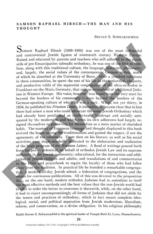 In nineteenth-century Western Europe, as traditional Judaism faced unprecedented challenges from modernization, Samson Raphael Hirsch (1808-1888) emerged as a pioneering yet polarizing figure who proved Orthodox Judaism could engage with secular culture while maintaining religious authenticity. Through analysis of Hirsch's extensive writings, particularly his seminal "Nineteen Letters" (1836) and newly translated texts, this research reveals how his unique theological synthesis reflected both steadfast Orthodox commitments and liberal European values. Hirsch's education at the University of Bonn shaped his distinctive approach to interpreting Jewish commandments (טעמי המצוות), combining innovative linguistic and symbolic methods that anticipated later biblical scholarship while sometimes venturing into questionable etymological speculation. While grounding his theology firmly in divine revelation at Sinai, Hirsch paradoxically incorporated contemporary German ideals of democracy, social progress, and human perfectibility. His controversial decision to establish separate Orthodox communities, especially in Frankfurt, created lasting institutional divisions within German Jewry that continue to influence modern Orthodox movements. By examining Hirsch's biographical context alongside theological and philosophical analysis of his work, this research demonstrates how his legacy embodies both the possibilities and tensions inherent in Orthodox Judaism's encounter with modernity.