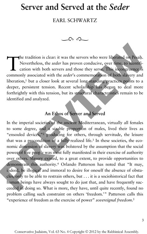 A profound paradox lies at the heart of the Jewish Passover seder: practices meant to celebrate freedom from bondage often reinforce social hierarchies through service relationships. By examining three key seder practices—reclining (hesseiv/hasibbah), the use of servers, and afikoman traditions—this research uncovers how rabbinic tradition incorporated Greco-Roman symposium customs that valued "sovereignal freedom," defined as authority over others. Through historical-critical analysis of Jewish texts spanning Mishnaic sources to contemporary Haggadot, the investigation reveals how these practices evolved within imperial Mediterranean societies and continue to shape modern celebrations. Despite commemorating liberation from Egyptian slavery, rabbinic sources consistently justify displays of social advantage as expressions of freedom, explicitly excluding servants, women, and others of lower status from practices like reclining. This structural contradiction persists in contemporary seders, where the experience of liberation remains stratified by socioeconomic roles. Authentic engagement with the Exodus narrative requires recognition of how current seder practices may inadvertently perpetuate the very power dynamics the festival ostensibly challenges, suggesting a need to revisit the biblical emphasis on service rather than being served.