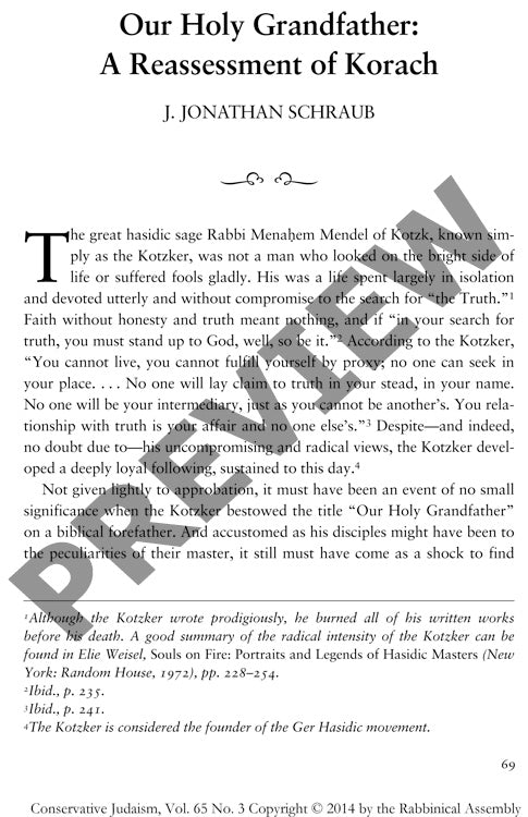 Korach's infamous biblical rebellion against Moses and Aaron deserves radical reexamination, particularly in light of the Kotzker Rebbe's striking reference to him as "Our Holy Grandfather." Traditional rabbinic interpretations have long condemned Korach as a demagogue, yet careful analysis reveals his protest as a legitimate theological vision that presaged core principles of rabbinic Judaism. Through close reading of biblical texts, rabbinic literature, and modern Jewish theological scholarship—with special attention to Isaac Luria's mystical concepts of linear versus circular community models—a more nuanced understanding emerges. Korach's central claim that "all the community are holy" represented an early articulation of democratic religious principles that would later become foundational to Jewish thought. Rather than personal ambition, his challenge to priestly hierarchy reflected a prophetic understanding that authentic covenant relationship requires direct divine access for all community members, not exclusively through priestly intermediaries. This reassessment demonstrates that Korach anticipated the essential Jewish principle of individual religious responsibility and prefigured the rabbinic movement's democratization of religious authority. His "rebellion" thus constituted a necessary theological correction toward authentic communal holiness, marking him as a spiritual ancestor worthy of veneration rather than a cautionary example of defiance.