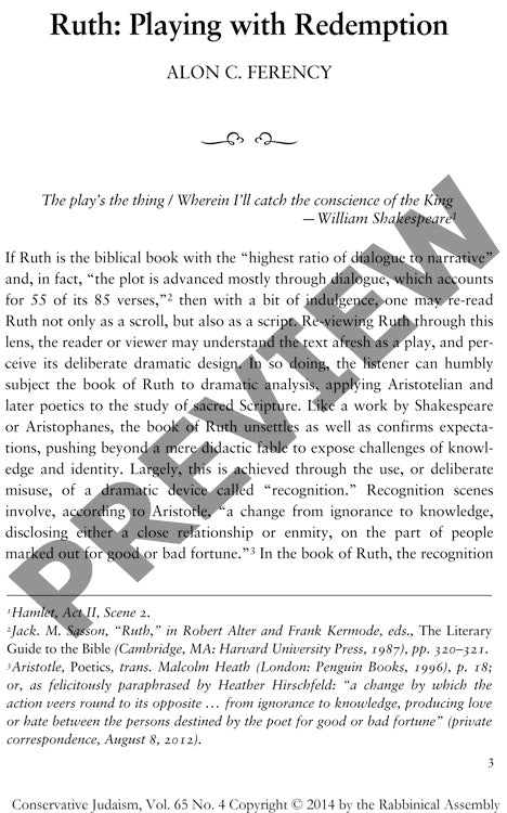The Book of Ruth stands apart in biblical literature as a masterwork of dramatic staging, with dialogue dominating 55 of its 85 verses—the highest ratio of direct speech in any biblical text. When analyzed through Aristotelian poetics, particularly the concept of "recognition scenes," the text reveals itself not merely as narrative but as a carefully crafted theatrical script. Key recognition scenes between characters—Naomi and her daughters-in-law, Ruth and Boaz, and the community chorus—function as pivotal moments that advance the plot and create space for divine intervention. The Hebrew verbal roots *shuv* (to return) and *ga'al* (to redeem) appear with striking frequency, weaving together themes of speech, recognition, and redemption through close dialogue patterns. These recognition scenes serve as catalysts for both human and divine action, with God's providence manifesting through moments of human acknowledgment. Through this dramatic structure, personal relationships transform into vehicles for theological insight and national redemption, suggesting that sanctity emerges through the very process of recognition itself. This theatrical reading opens new interpretive possibilities for understanding both the literary sophistication and theological depth of Ruth's ancient text.