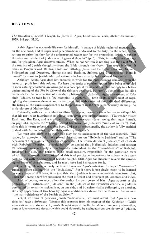 Jewish scholarship faces an ongoing challenge: balancing rigorous academic analysis with deep religious understanding. Three major works illuminate this tension while advancing our comprehension of Jewish thought and contemporary Jewish life. Jacob B. Agus's "The Evolution of Jewish Thought" ambitiously traces Jewish intellectual development from biblical times through the Haskalah, synthesizing the contributions of prophets, rabbis, philosophers, and mystics. While the work provides valuable systematic overview for advanced students, its rationalistic bias occasionally oversimplifies complex phenomena, particularly in treating Kabbalistic thought. Through close textual analysis and comparative assessment, this review also examines Abraham Heschel's "God in Search of Man," defending its approach as legitimate religious thinking rather than mere philosophical argumentation about religion. Albert Gordon's "Jews in Suburbia" earns praise for empirical rigor while revealing problematic middle-class assumptions. Together, these works demonstrate that authentic Jewish scholarship must recognize Judaism's unique characteristics that transcend conventional academic categories, while resisting the temptation to conflate Jewish thought with bourgeois perspectives. The analysis reveals the persistent challenges of maintaining scholarly objectivity while honoring religious commitment in Jewish intellectual discourse.