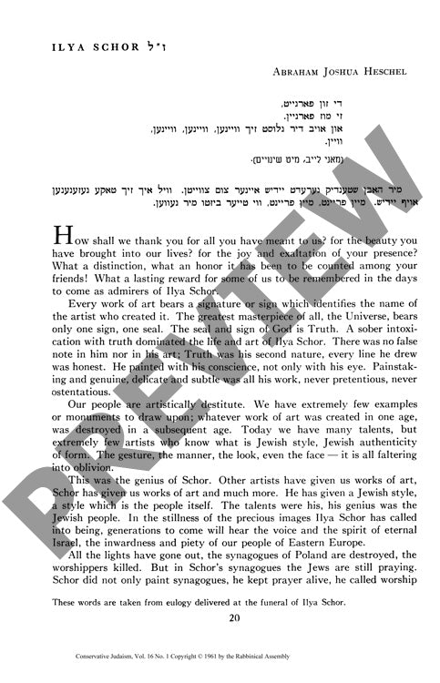 This eulogy for Jewish artist Ilya Schor, delivered by Abraham Joshua Heschel and published in Conservative Judaism (1961), examines the artistic legacy and cultural significance of Schor's work in preserving Eastern European Jewish heritage. Through qualitative analysis of Schor's artistic contributions, Heschel employs theological and aesthetic frameworks to evaluate the artist's role in maintaining Jewish cultural memory following the destruction of European Jewish communities. The methodology combines artistic criticism with religious interpretation, positioning Schor's paintings and metalwork as both aesthetic achievements and spiritual documents. Key findings indicate that Schor uniquely captured authentic Jewish style and atmosphere, particularly in his depictions of synagogues, Torah ceremonies, and Sabbath observances, preserving cultural elements that would otherwise be lost to history. Heschel argues that Schor's genius lay not merely in technical skill but in his ability to embody and transmit the "inwardness and piety" of Eastern European Jewry through visual art. The study concludes that Schor's death marked the end of an era in Jewish art, as no subsequent artist possessed his intimate knowledge of destroyed Polish synagogues and traditional Jewish life, making his work an irreplaceable repository of cultural memory and spiritual expression.