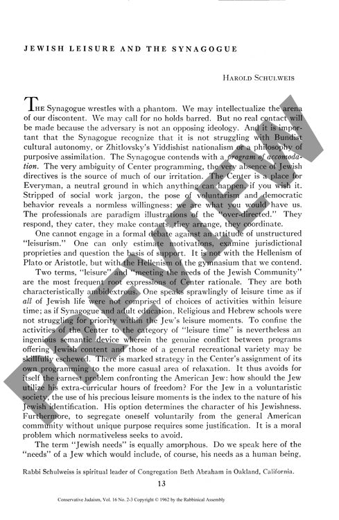 A stark ideological divide emerged between American synagogues and Jewish community centers in the mid-20th century, revealing a deeper tension between authentic Jewish programming and secular assimilation. Through critical analysis, Harold Schulweis demonstrates that synagogues faced competition not from alternative Jewish philosophies, but from community centers' "leisurism" approach - one that prioritized secular recreation while marginalizing substantive Jewish cultural and religious content. This shift represented what Schulweis terms "institutionalized collective assimilation," whereby Jewish organizations maintained ethnic membership while adopting non-sectarian programming. Centers misapplied Church-State separation principles to Jewish communal organization, resulting in funding structures that favored secular activities over religious education and cultural initiatives. Such practices fundamentally misunderstood Judaism's civilizational character, which inherently weaves together people, culture, ritual, and faith. The analysis argues for synagogues to reclaim their position as unifying communal institutions by broadening their programming while preserving religious authenticity. It further advocates restructuring community funding priorities to support agencies that promote Jewish cultural, moral, and religious development rather than recreational programming devoid of distinctive Jewish purpose.