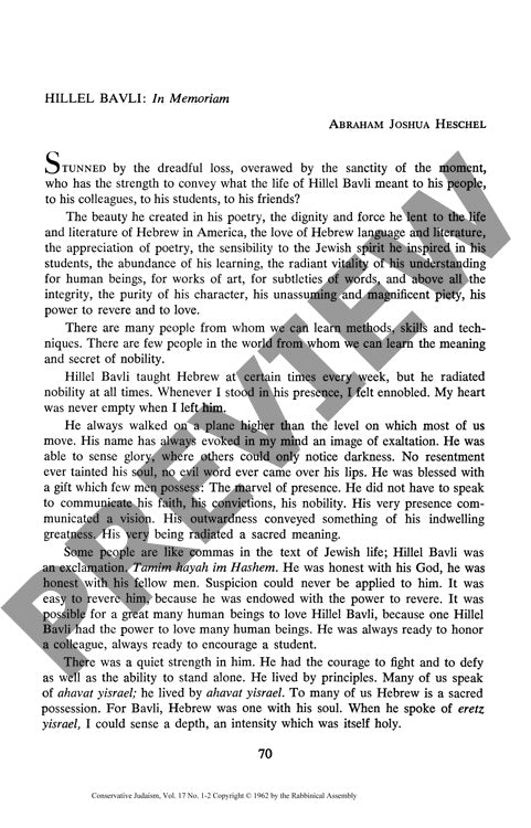 This memorial tribute examines the life and legacy of Hillel Bavli, a distinguished Hebrew poet and educator in America, through the commemorative reflections of Abraham Joshua Heschel. The article employs biographical analysis and personal testimony to document Bavli's contributions to Hebrew literature and Jewish intellectual life in mid-twentieth century America. Heschel's eulogy reveals Bavli as a rare synthesis of traditional Jewish piety and modern literary sensibility, representing what the author characterizes as one of the few successful manifestations of "the great experiment of modern Judaism." The methodology combines personal reminiscence with cultural analysis to position Bavli as a crucial bridge between Eastern European Jewish tradition and American Jewish literary culture. Key findings emphasize Bavli's dual mastery of sacred and secular domains, his embodiment of authentic Jewish learning, and his role as a "witness" to vanishing Eastern European Jewish civilization. The article concludes that Bavli's death represents not merely individual loss but the disappearance of an entire cultural world, making him a "fortress" of tradition whose passing diminishes the authentic transmission of Jewish wisdom. This study contributes to understanding the challenges of cultural continuity in American Jewish intellectual life during the post-Holocaust period.