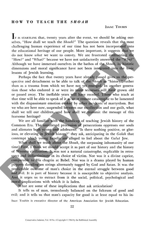 Two decades after the Holocaust, Jewish educators still struggle to meaningfully integrate this defining catastrophe into their curricula, hampered by uncertainty about both methods and goals. Drawing on educational theory and historical analysis, Toubin proposes a comprehensive framework for Holocaust instruction that emphasizes human moral agency over theological interpretation. The analysis reveals critical gaps in available teaching materials, with only two American Jewish educational organizations having developed formal guidelines by 1964. Through normative analysis, the study identifies essential themes for Holocaust education: the nature of moral choice, individual responsibility in preventing atrocities, the inadequacy of passive spectatorship, and lessons about Jewish unity and resilience. Toubin advocates teaching the Holocaust as fundamental to both Jewish and Western civilization history, recommending instruction begin at adolescence using factual, unembellished historical content. This approach positions the Holocaust as crucial to contemporary Jewish identity and moral education, offering specific pedagogical strategies that emphasize practical lessons for preventing future atrocities rather than abstract theological speculation.
