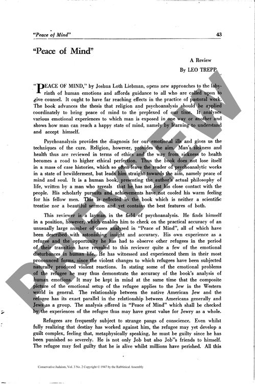 Joshua Loth Liebman's pioneering synthesis of psychoanalysis and religious wisdom offers a compelling roadmap for emotional healing that resonates particularly with displaced populations and trauma survivors. Through textual analysis and empirical observations of Jewish refugee communities, this review validates Liebman's integrated approach, which harnesses psychoanalysis for diagnosis while drawing on religious traditions for ethical guidance. The evaluation demonstrates how "Peace of Mind" effectively addresses emotional disturbances - from guilt complexes to self-hatred and anxiety - patterns consistently observed among displaced populations and broader Jewish communities. Liebman's framework, grounded in Jewish theological principles yet embracing scientific methodology, proves especially valuable in pastoral counseling applications. The work's distinctive contribution lies in its advancement of Jewish apologetics, illustrating Judaism's adaptability to modern psychological challenges. Most significantly, its emphasis on balanced self-love as a foundation for loving others aligns with traditional Jewish ethics while providing practical tools for community healing and reconstruction in the aftermath of collective trauma.