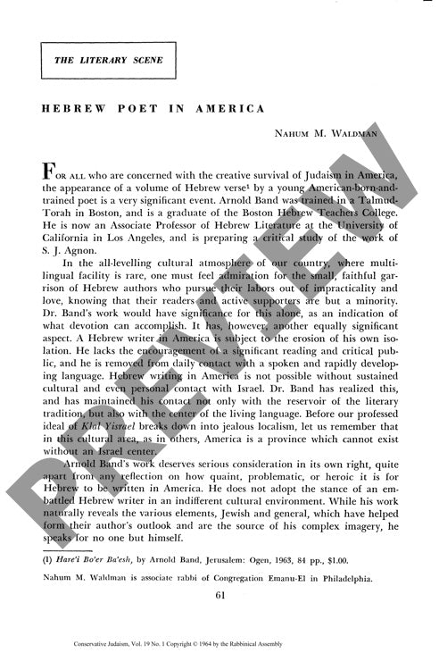 Arnold Band's Hebrew poetry collection "Hare'i Bo'er Ba'esh" stands as a remarkable testament to Hebrew literary creativity flourishing beyond Israel's borders. As an American-born Hebrew poet and UCLA professor, Band crafts verses that bridge two worlds, maintaining deep cultural connections with Israel while writing from within the American Jewish experience. Through close textual analysis of selected poems, Band's work reveals a penetrating awareness of life's harsh realities, exploring parental ambivalence, moral complexity, and the corruption of innocence. His poetry weaves biblical and rabbinic sources into contemporary concerns about authenticity, human cruelty, and existential questions that echo Job's ancient struggles. Operating as a modern, secular maggid, Band deploys scriptural allusions and original interpretations to critique modern indifference and escapism. His sophisticated verses demand extensive knowledge of literary traditions while functioning on multiple interpretative levels. Band's contribution to Hebrew literature demonstrates the language's adaptability while addressing universal human concerns through a distinctly Jewish lens. Rather than speaking as a community representative, his poetry challenges readers both aesthetically and morally from the perspective of a complex individual, reflecting the fragmented nature of modern meaning-making systems.