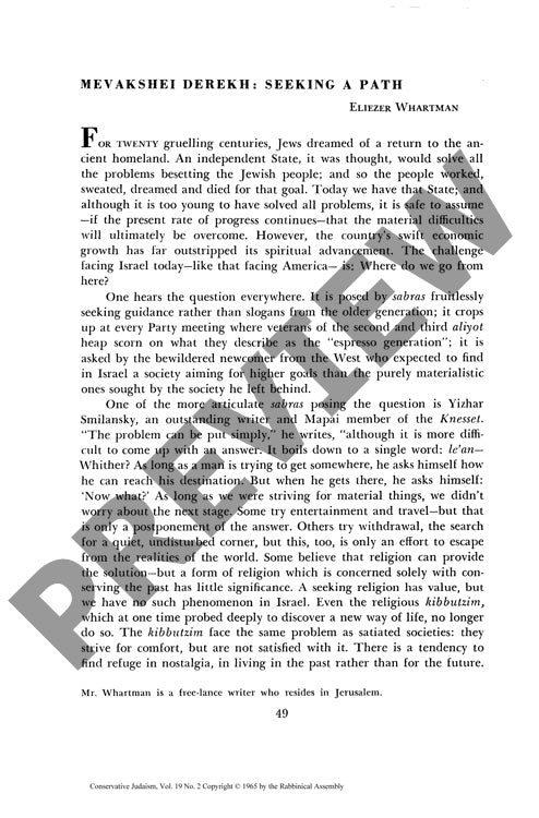 In 1960s Israel, a profound spiritual vacuum emerged in the wake of achieved statehood, prompting diverse groups of Israelis to forge an innovative path between secular nationalism and Orthodox tradition. The Mevakshei Derekh (Seekers of a Path) movement arose from this crisis, uniting kibbutzniks, urban intellectuals, and native-born sabras in their quest for authentic Jewish spiritual expression. Through ethnographic research, including participant observation and member interviews, this research reveals a generational schism where the founding generation's revolutionary idealism gave way to materialism and spiritual emptiness among their children. Movement participants, drawing from both secular and moderately religious backgrounds, organized retreats and study groups to develop novel forms of Jewish spiritual practice and social engagement. Their journey exposed a compelling paradox: members struggled to reconcile intellectual skepticism toward traditional religious concepts while yearning for meaningful Jewish identity and community connection. Though hampered by limited professional leadership and resources, Mevakshei Derekh exemplified a broader societal need to transcend material achievement through personal spiritual growth and social responsibility. The movement's efforts to bridge secular Zionism and religious tradition hold lasting implications for Israel-Diaspora relations and the ongoing evolution of Israeli Jewish identity.