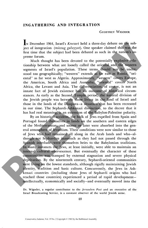 Israel's dramatic population shifts after 1948 sparked deep cultural tensions between Jewish immigrants from "oriental" regions (North Africa, the Levant, and Asia) and their "western" counterparts (Europe, America, South Africa, and Australia) - tensions that would shape the nation's social fabric for decades to come. Drawing upon Israel's Statistical Year-Book, 1964 Knesset proceedings, and Hebrew University sociological surveys, clear patterns emerge of systematic disadvantage faced by oriental immigrants, despite their growing demographic presence from 9.7% in 1948 to 28.7% by 1963. European and American immigrants achieved notably higher rates of professional placement (40% versus 19%) and better housing conditions, while oriental immigrants encountered persistent barriers in education, employment, and social mobility. Statistical analysis reveals these disparities stemmed from structural factors: inadequate educational support systems, economic pressures forcing early workforce entry, and cultural disconnection from Israel's Western-oriented institutional framework. Although official policies proclaimed non-discrimination, natural hierarchies emerged that consistently placed oriental populations at lower socioeconomic levels. While economic integration has shown progress, achieving meaningful social and cultural integration requires addressing systemic educational inequalities and developing more pluralistic approaches that both preserve valuable oriental Jewish traditions and enable advancement within Israel's Western-oriented society.