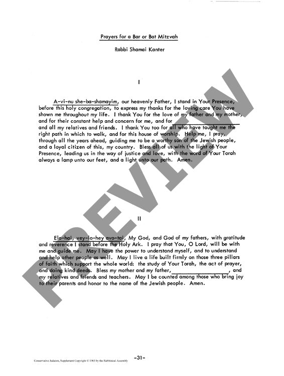In 1965, as American Judaism increasingly embraced gender-inclusive ceremonies, Rabbi Shamai Kanter compiled a groundbreaking collection of 428 prayers for both Bar and Bat Mitzvah rituals, published in Conservative Judaism by the Rabbinical Assembly. These carefully crafted liturgical compositions weave together timeless themes of divine gratitude, parental appreciation, and commitment to Jewish values, while serving dual roles as ceremonial guideposts and educational tools. Through systematic documentation and analysis, including detailed examination of two representative prayers, the collection reveals a consistent liturgical structure combining Hebrew transliterations with English translations. Each prayer deliberately emphasizes Judaism's three foundational pillars—Torah study, prayer, and acts of kindness—while invoking divine guidance for young people transitioning to religious adulthood. The prayers reflect both traditional elements and modern adaptations, providing Conservative synagogue communities with standardized liturgical options that reinforce Jewish identity during these pivotal coming-of-age ceremonies. This comprehensive compilation represents a significant mid-twentieth century contribution to Conservative Jewish liturgical literature, bridging ancient tradition with contemporary practice.
