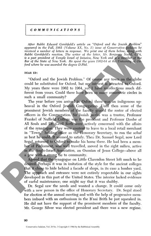 This correspondence examines contrasting perspectives on Jewish life at Oxford University in the 1960s, specifically responding to Rabbi Edward Gershfield's 1965 article "Oxford and the Jewish Problem." The exchange presents qualitative observations and personal testimonies from Benjamin Nadel, a former Oxford D.Phil. student (1962-1964), who challenges Gershfield's assessment of the Oxford Jewish community. Nadel's methodology consists of participant observation and experiential analysis, describing synagogue reorganization efforts led by Dr. Samuel Segal, student participation in Sabbath services, and community activities supporting Jewish students. His findings suggest a "vibrant Jewry" characterized by religious fervor, inclusive worship practices, and effective community support systems, including arrangements for lifecycle events and regular minyan attendance of approximately thirty congregants. However, Rabbi Gershfield's response maintains his original assessment, arguing that while a "handful of vibrant Jews" demonstrated "heroic" commitment to Jewish life, the broader student population remained largely disengaged. The correspondence reveals fundamental disagreements about measuring Jewish communal vitality and highlights the challenges facing Jewish students in British university settings. The exchange illuminates broader questions about Jewish identity, assimilation, and community sustainability in academic environments, while demonstrating how individual experiences can yield divergent interpretations of the same communal situation.